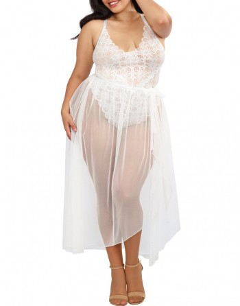 Quel superbe et original modèle de body grande taille blanc dans une dentelle haute qualité. Ce body blanc très sexy pour femme ronde est largement échancré sur les hanches pour vous donner une silhouette incroyable. Un dos quasi nu et des bretelles réglables. Pour l'accompagner, au moins en début de soirée, une jupe longue dans une fine maille transparente amovible qui se ferme sur l'avant. Alors à vous de décider le meilleur moment pour la retirer.